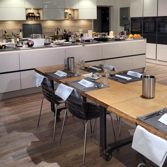 In unserem frisch eingerichteten Kochatelier in Bad Neuenahr könnt ihr mit bis zu 40 Personen feiern. Auf 150 qm ist viel Platz für gute Laune und ein richtig leckeres Vier-Gang-Menü.